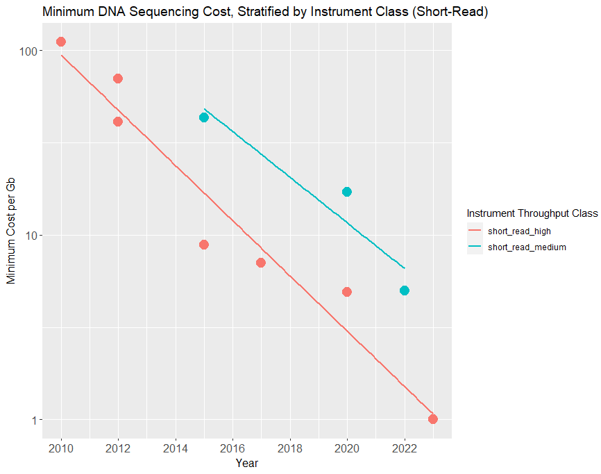 The first order of magnitude cost decline came in the 2010-2015 period with Illumina’s HiSeq line, the price of sequencing plummeting from ~$100/Gb to ~$10/Gb; this was followed by 5 years of relative stagnation, for reasons unknown; and in the past 2 years, there’s been another order of magnitude drop, with multiple competitors finally surpassing Illumina and approaching $1/Gb prices. The sequencing market is starting to really heat up, and that likely means the biennial doubling trend will hold; if it does, and if current prices are to be believed, then we can expect sequencing prices to hit $0.1/Gb around 2028-2029.