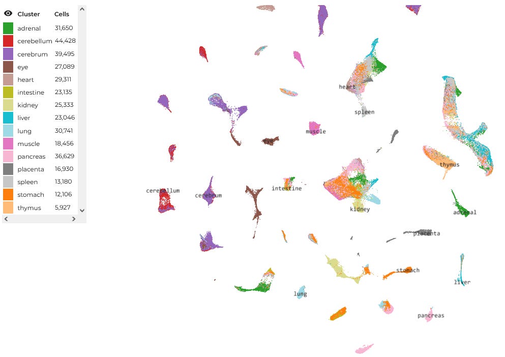 The upshot is that these omics profiles, as they are called, act as proxies for the cells’ unique functional identities. Therefore, by assaying enough cells, one can develop a “map” of single-cell function, which can be used to understand the behavior of biological systems with incredible precision. Whereas earlier bulk assays lost functionally consequential inter-cellular heterogeneity in the tissue-average multicellular soup, now this heterogeneity can be resolved in its complete, single-cell glory. These single-cell maps look like so (this one is of a very large human fetal cell atlas, which you can explore here):