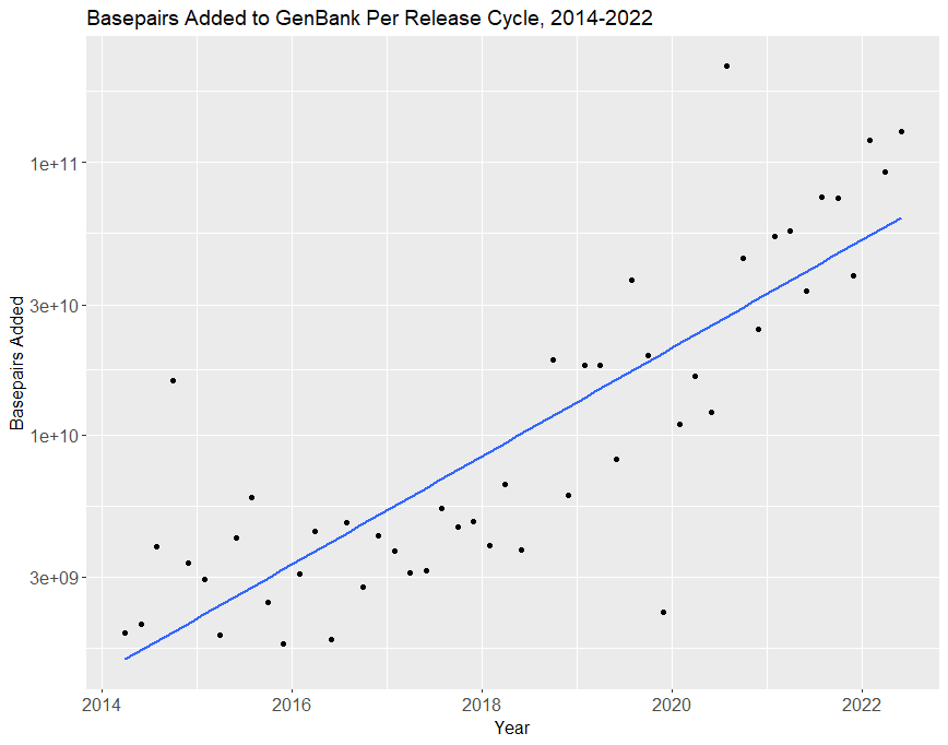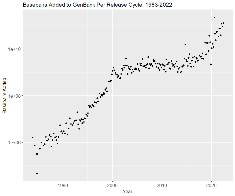 This exponential decline in price has led to a corresponding exponential increase in genome sequencing data. Since around 2014, the number of DNA bases added per release cycle to GenBank, the repository of all publically available DNA sequences, has doubled roughly every 18 months.