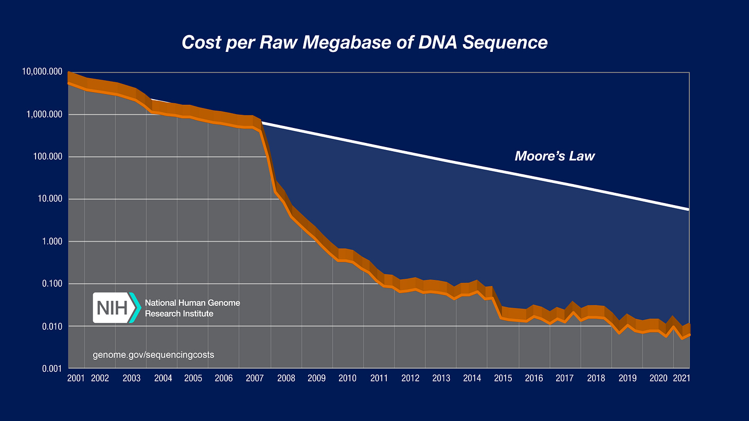 Over the past 12 years, the price per gigabase on high-volume, short-read sequencers has declined by almost two orders of magnitude, halving roughly every 2 years—slightly slower than Moore’s law.