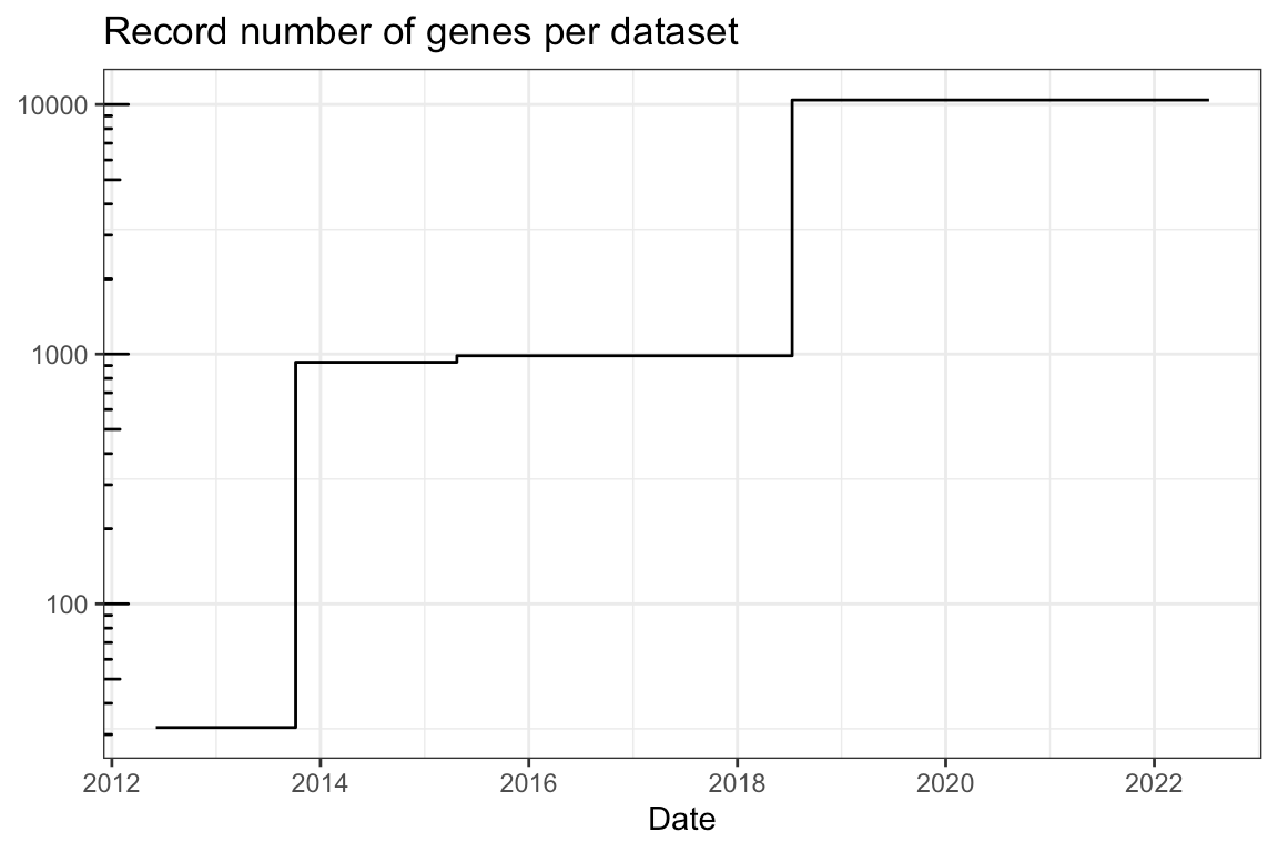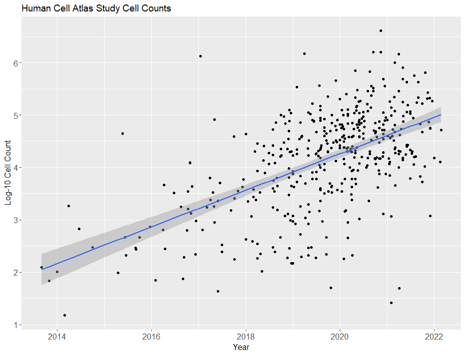 This is a plot of the number of cells in each study added to the Human Cell Atlas, which aims to “create comprehensive reference maps of all human cells—the fundamental units of life—as a basis for both understanding human health and diagnosing, monitoring, and treating disease.” The number of cells per study has been increasing by an order of magnitude a little under every 3 years—and the frequency with which studies are added is increasing too.