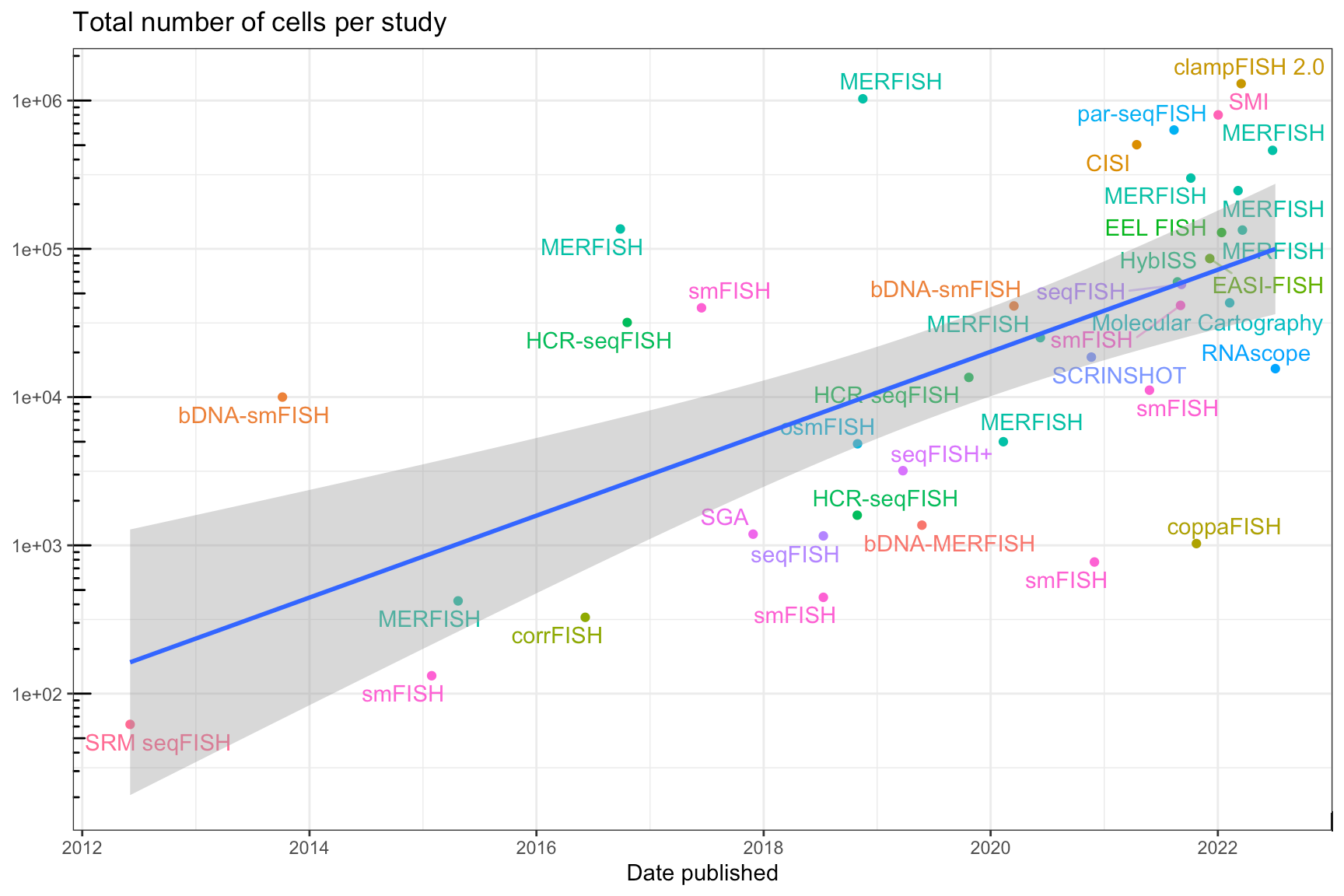 A jump to ~100 cells was enabled by sample multiplexing, and then a jump to ~1,000 cells was achieved by large-scale studies using integrated fluidic circuits, followed by a jump to several thousands of cells with liquid-handling robotics. Further orders-of-magnitude increases bringing the number of cells assayed into the tens of thousands were enabled by random capture technologies using nanodroplets and picowell technologies. Recent studies have used in situ barcoding to inexpensively reach the next order of magnitude of hundreds of thousands of cells.
