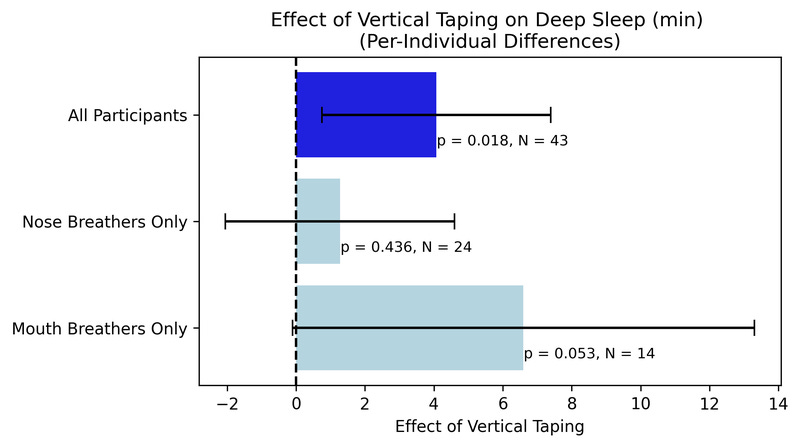 The average participant's deep sleep time increased by about 4 minutes when vertical taping, and this effect is significant. The effect seems to be more pronounced in mouth breathers than in nose breathers.