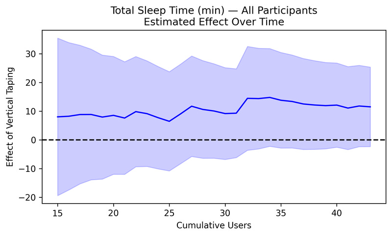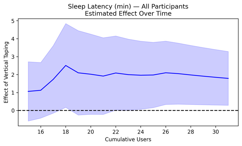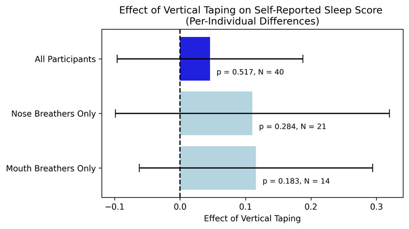 The average participant takes longer to fall asleep with vertical tape, with sleep latency increasing by about 2 minutes. Perhaps it is uncomfortable to fall asleep with tape on, especially as one gets used to it.