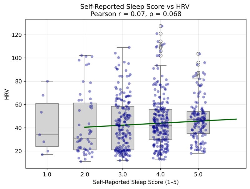 But when we look at HRV instead of the device’s overall sleep score (which aggregates several sleep metrics), there is basically no correlation between HRV and self-reported sleep quality.