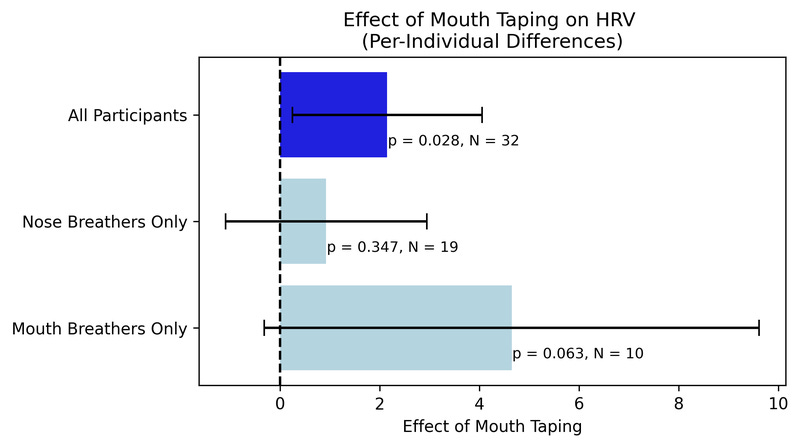Right now, our data shows that the average participant experiences a 2ms increase in HRV when taping. Pretty cool! This effect seems to be more pronounced for mouth breathers (+5ms) than nose breathers (+1ms, maybe?).