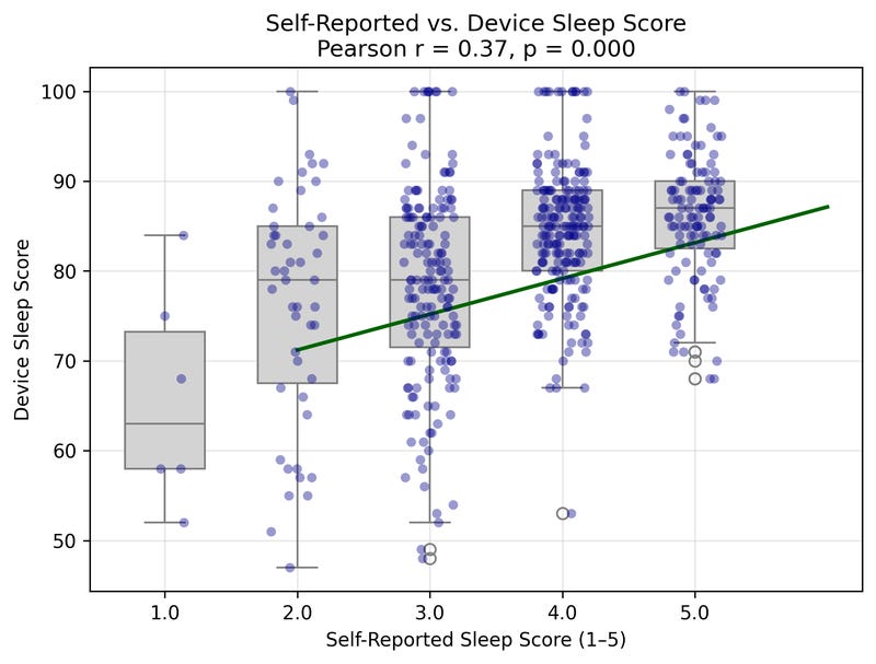 Is 2ms a lot though? That’s like moving up 0.4 standard deviations in the population – e.g. from the 50th percentile to the 66th. Would you feel the difference of that effect size? In our data, self-reported sleep scores correlate with device sleep scores. This makes sense, and it’s good to see the subjective data align with the objective measurement.