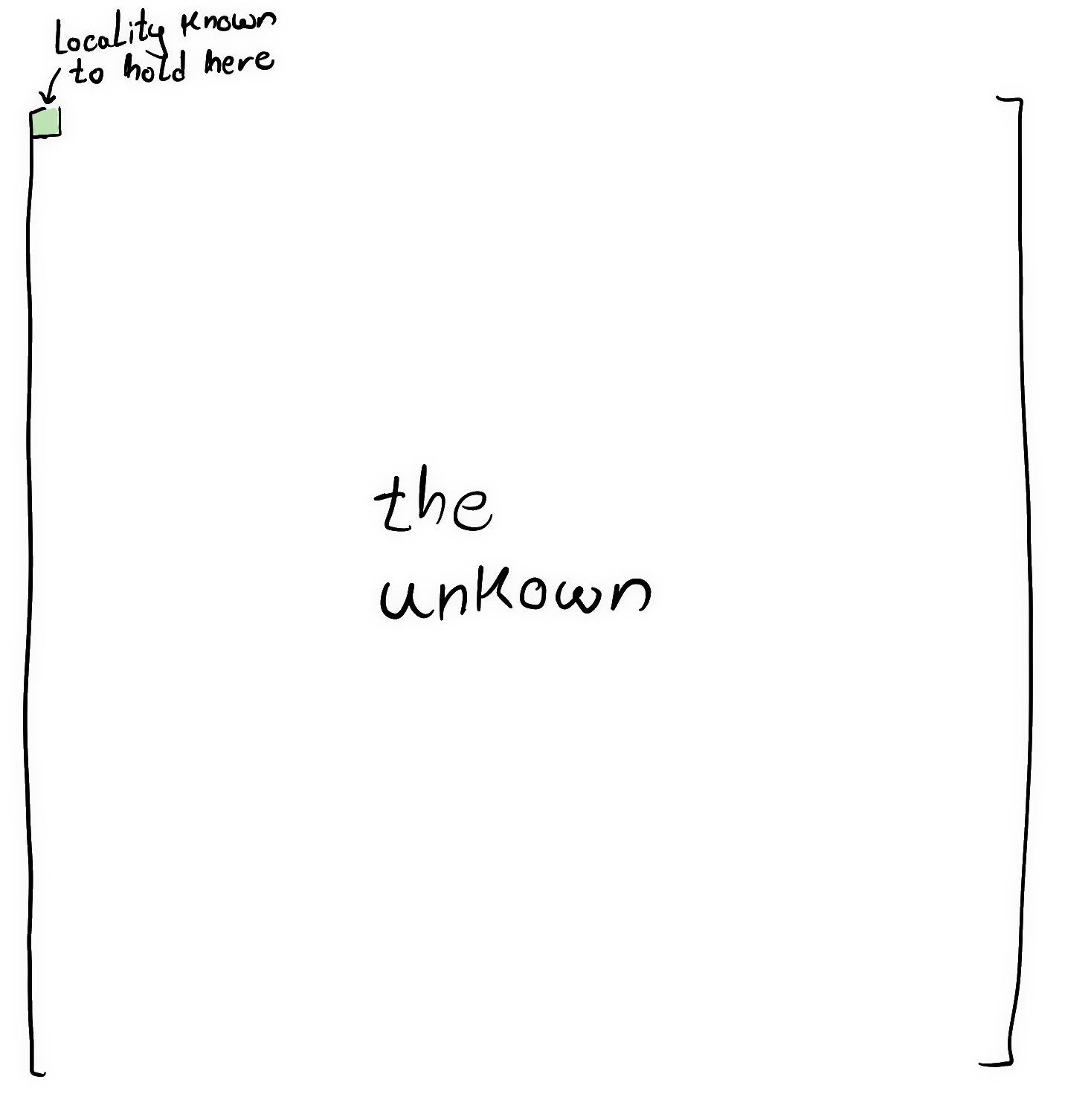 where the unknown might be highly irregular and dense. But at present, that green box represents a fraction of 10^{-33} of the rows and columns, and only there do we know that the matrix is sparse, i.e. locality holds.11